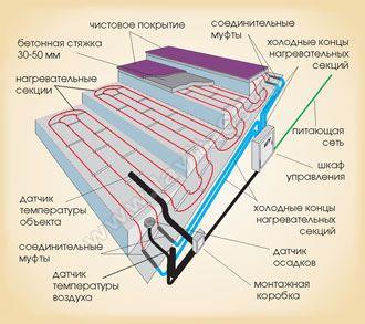 Внедрение антиобледенительных систем на основе нагревательных кабелей при условии правильного их проектирования позволяет полностью исключить процесс образования наледей при незначительном энергопотреблении. Установка для борьбы с обледенением должна включать в себя достаточно надежный, распределенный по всей площади нагреватель, систему управления этим нагревателем и систему питания.