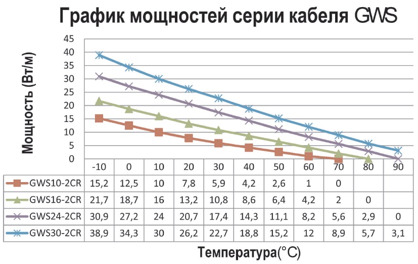 Кабель серии GWS предназначены для защиты трубопроводов от замерзания. Кабель выделяет тепло благодаря работе полупроводниковой матрицы, характеризующейся положительным температурным коэффициентом (PTC - Positive Temperature Coefficient). Его способностью является то, что в зависимости от окружающей температуры кабель автоматически регулирует свою теплоотдачу.